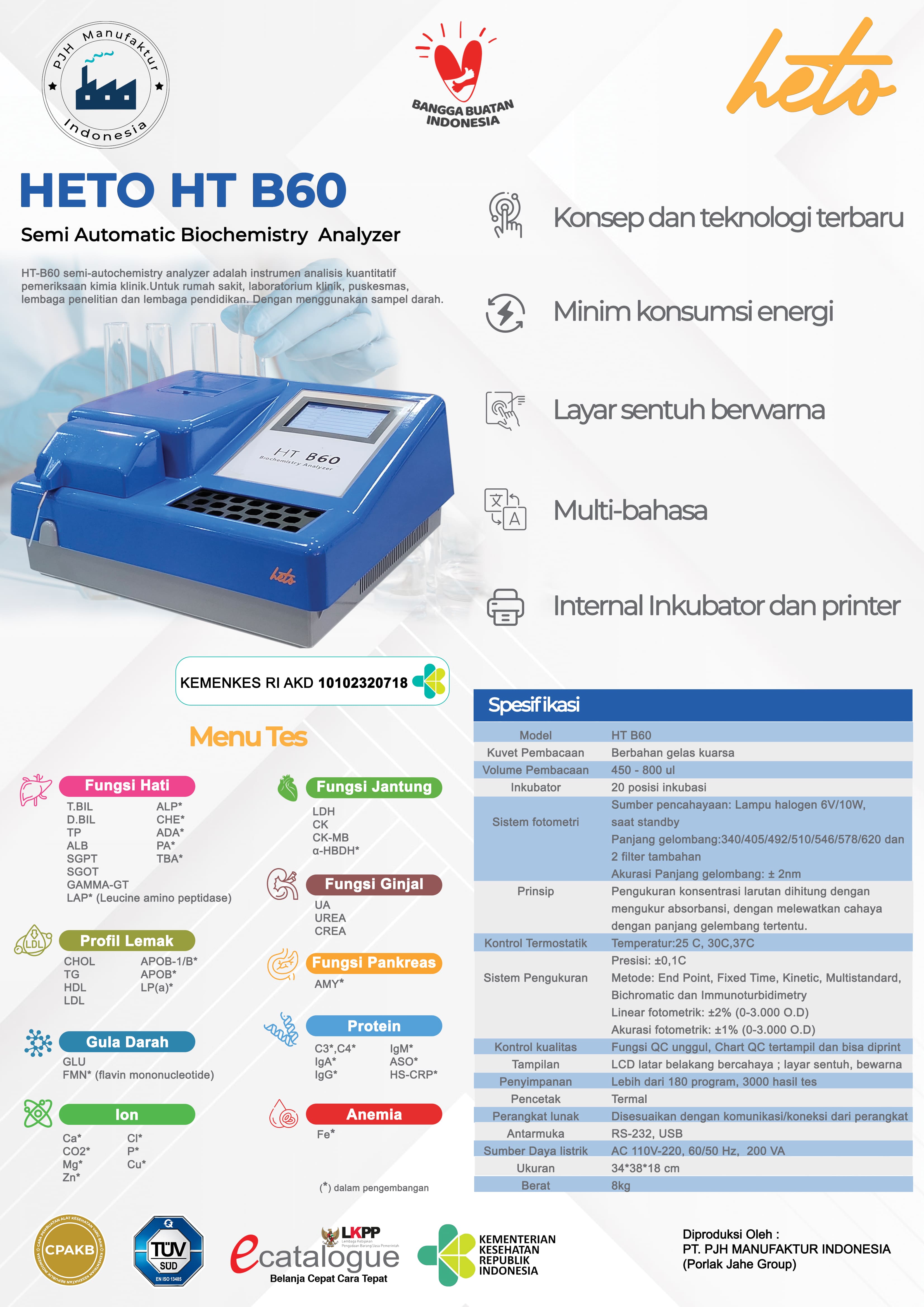 HT-B60 semi-autochemistry analyzer adalah instrumen analisis kuantitatif pemeriksaan kimia klinik. Untuk rumah sakit, laboratorium klinik, puskesmas, lembaga penelitian dan lembaga pendidikan dengan menggunakan sampel darah.