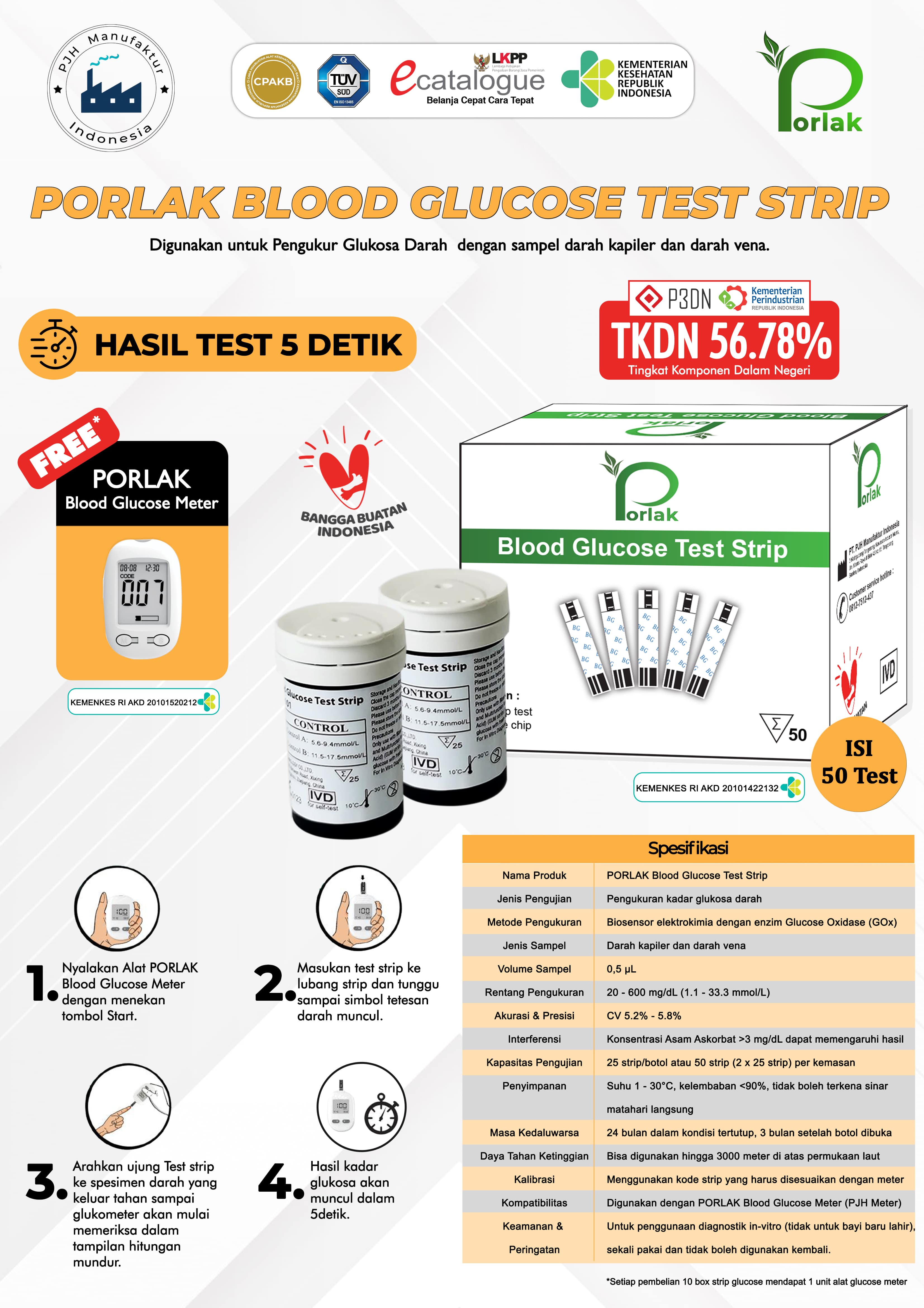 Nama Produk : PORLAK Blood Glucose Test Strip. Jenis Pengujian : Pengukuran kadar glukosa darah. Metode Pengukuran : Biosensor elektrokimia dengan enzim Glucose Oxidase (GOx). Jenis Sampel : Darah kapiler dan darah vena. Volume Sampel : 0,5 µL. Waktu Pengukuran : 5 detik. Rentang Pengukuran : 20 - 600 mg/dL (1.1 - 33.3 mmol/L). Akurasi & Presisi : CV 5.2% - 5.8%. Interferensi : Konsentrasi Asam Askorbat >3 mg/dL dapat memengaruhi hasil. Kapasitas Pengujian : 25 strip/botol atau 50 strip (2 x 25 strip) per kemasan. Penyimpanan : Suhu 1 - 30°C, kelembaban <90%, tidak boleh terkena sinar matahari langsung. Masa Kedaluwarsa : 24 bulan dalam kondisi tertutup, 3 bulan setelah botol dibuka. Daya Tahan Ketinggian : Bisa digunakan hingga 3000 meter di atas permukaan laut. Kalibrasi : Menggunakan kode strip yang harus disesuaikan dengan meter. Kompatibilitas : Digunakan dengan PORLAK Blood Glucose Meter (PJH Meter). Keamanan & Peringatan : Untuk penggunaan diagnostik in-vitro (tidak untuk bayi baru lahir), sekali pakai dan tidak boleh digunakan kembali.